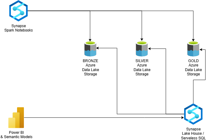 The data layer is currently being integrated with Azure Synapse, which allows the use of Spark and serverless SQL to analyze large datasets directly within the lake. This integration provides an easy path to building analytical models, aggregating metrics, and exposing insights to dashboarding tools such as Power BI.