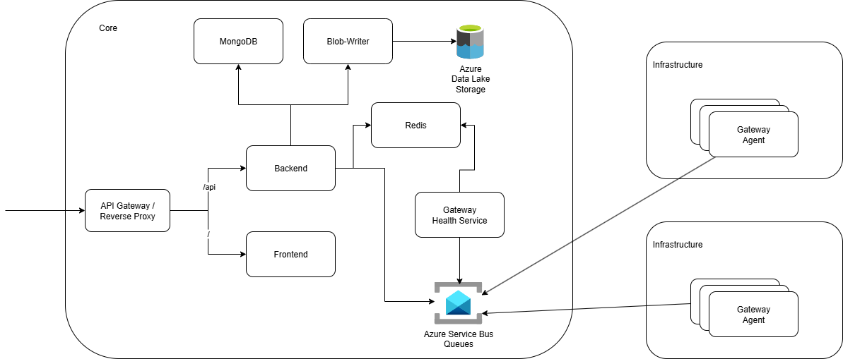 Gateway agents periodically send heartbeat messages through the Service Bus. These messages are handled by a dedicated gateway healthcheck service, which updates Redis accordingly. This separation ensures that the main backend remains focused on API and data processing tasks instead of being burdened by real-time state management.