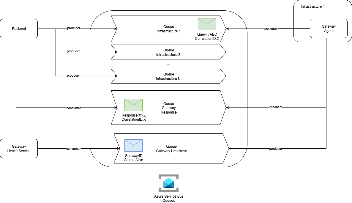 Each monitored infrastructure has its own dedicated queue, along with specialized queues for script responses and heartbeats. This design isolates communication per environment and improves both scalability and security.